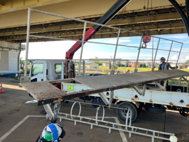 老朽化のため撤去することもありますが、今回は橋脚をコンクリートで補強する際に検査路が干渉するため、一時的に撤去する工事でした。