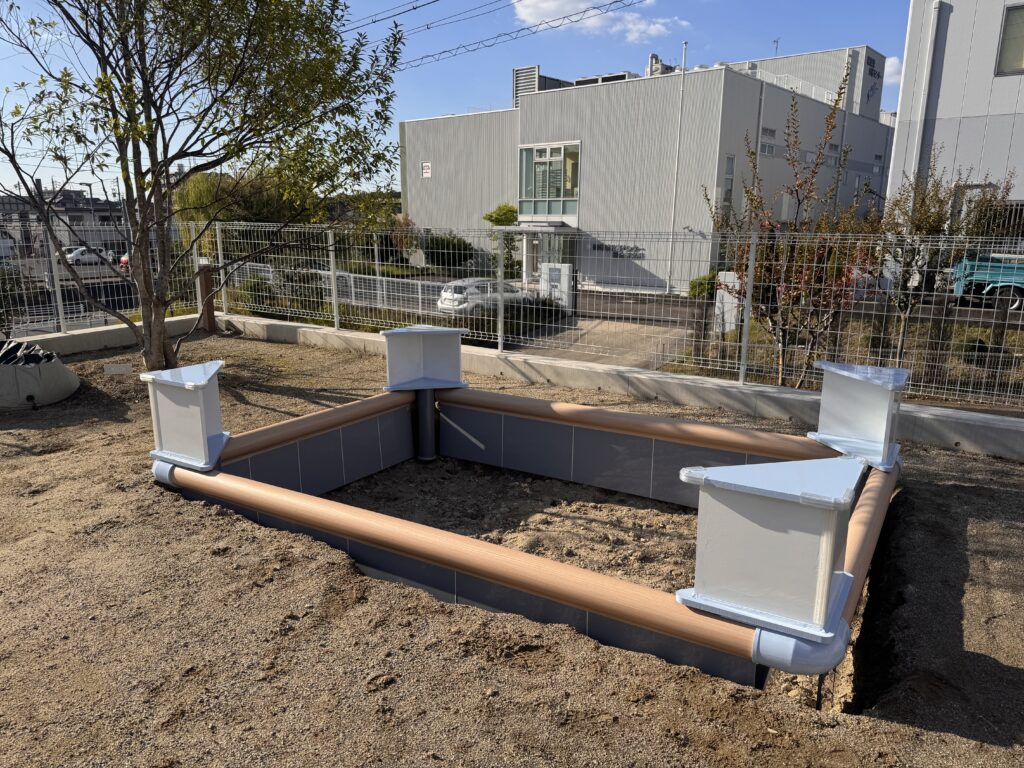 やっとのことで完成した穴に、前回製作風景をご紹介した砂場の枠を設置します。