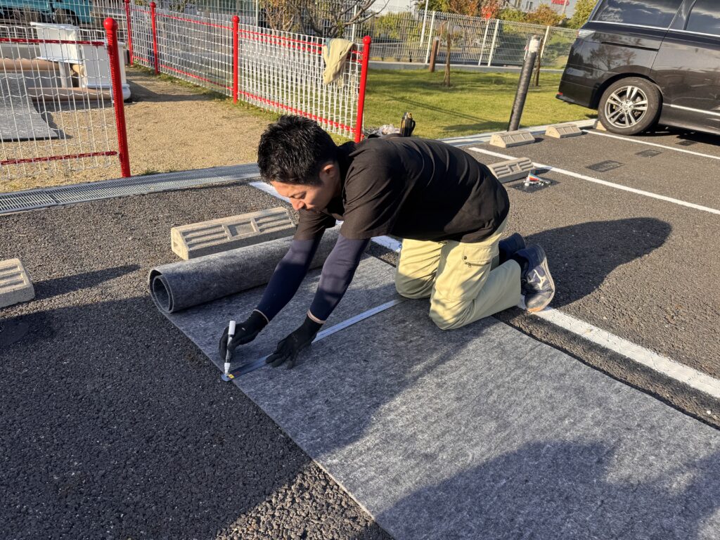 穴と枠の間に、吸出し防止材を敷いていきます。