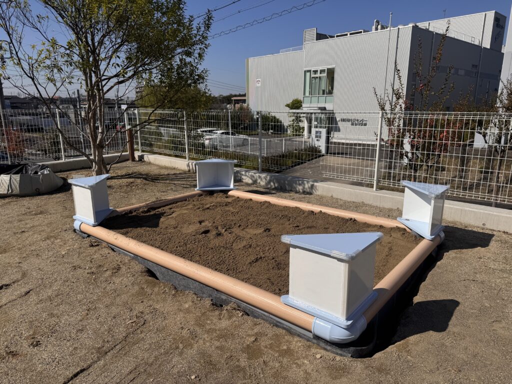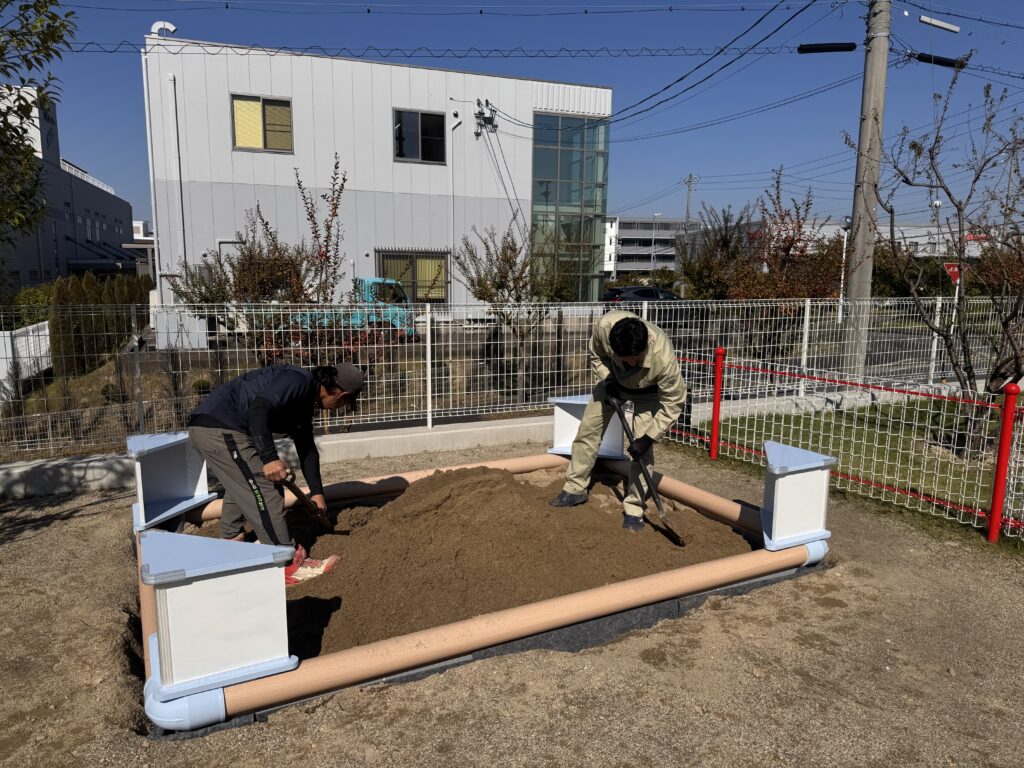 らいふほいくえんお砂場製作記第3弾、今回はついに砂場の完成の様子をご紹介します。