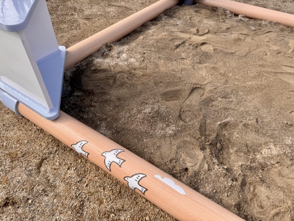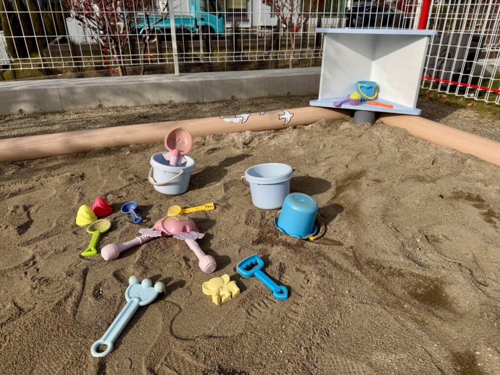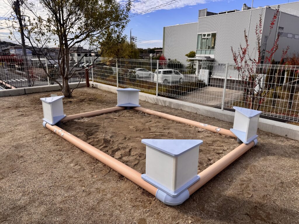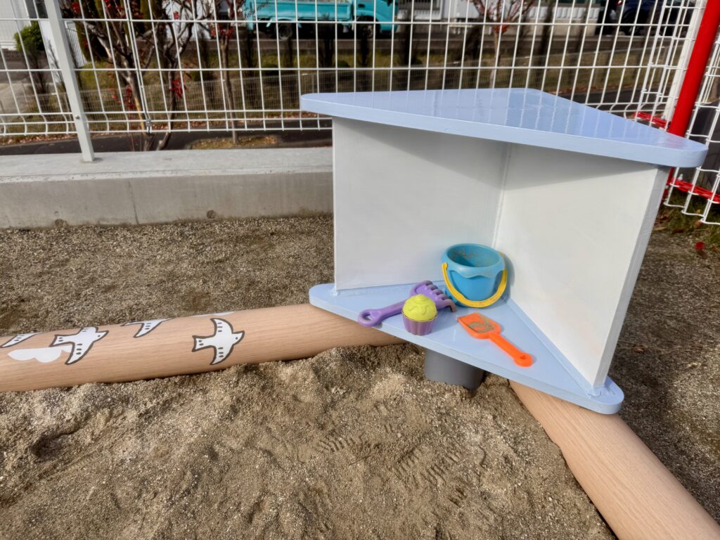 保育士さんが腰掛けられたり、子どもたちのおもちゃを置けたり、オリジナル製品だからこそ、思いやりの詰まったお砂場ができました。
