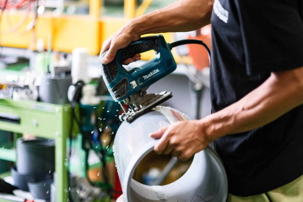 塩ビパイプをはじめとするプラスチック素材を機械・治具を用いて手加工します。